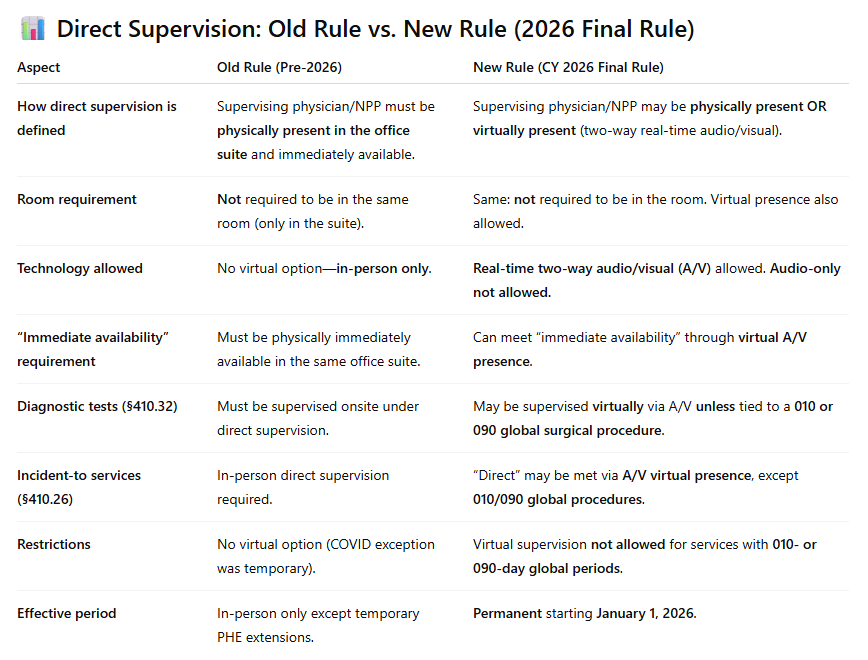 It’s official - In the CY 2026 Medicare Physician Fee Schedule Final Rule, CMS has announced that direct supervision may now be provided permanently through real-time, two-way audio/visual telecommunications (video required—audio-only does not qualify).